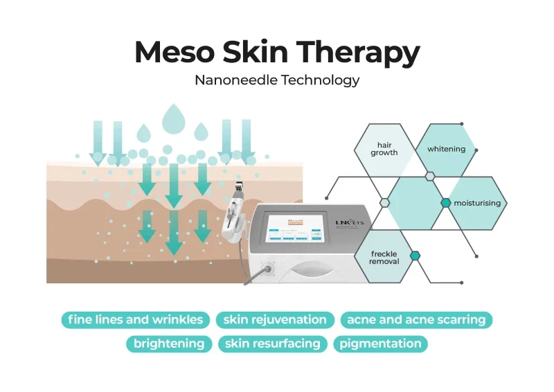 The Meso Skin Therapy is a non-invasive treatment. It rejuvenates and revitalises the skin using a powerful blend of active serums. These serums are infused deep into the dermis. Consequently, the treatment enhances hydration, smoothness, and glow. It also improves your overall skin texture and tone.
